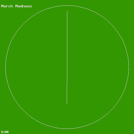<?php $imSize = 512; $clockSize = $imSize - 40; $today = getdate(); $hour = $today[hours]; $minutes = $today[minutes]; $seconds = $today[seconds]; if ($hour > 12) { $hour -= 12; } $hourDegress = $hour * 30; $hourDegress += $minutes / 2; $minDegress = $minutes * 6; //* the cordinate system stars at 3:00 $hourDegress -= 90; if ($hourDegress < 0) { $hourDegress += 360; } $minDegress -= 90; if ($minDegress < 0) { $minDegress += 360; } //* convert to radians $hourRadians = $hourDegress / 57.295779513082; $minRadians = $minDegress / 57.295779513082; $myImage = ImageCreate($imSize, $imSize); $white = ImageColorAllocate($myImage, 255, 255, 255); $black = ImageColorAllocate($myImage, 0, 0, 0); // $red = ImageColorAllocate($myImage, 255, 0, 0); $green = ImageColorAllocate($myImage, 50, 151, 0); // $blue = ImageColorAllocate($myImage, 0, 0, 255); ImageFill($myImage, 0, 0, $green); Imageinterlace($myImage, 1); //* draw the clock circle Imagearc($myImage, $imSize/2, $imSize/2, $clockSize, $clockSize, 0, 359, $white); //* draw the hour hand $hourHandLen = ($clockSize / 2) * 0.6; $x2 = $imSize/2 + ($hourHandLen * cos($hourRadians)); $y2 = $imSize/2 + ($hourHandLen * sin($hourRadians)); ImageLine($myImage, $imSize/2, $imSize/2, $x2, $y2, $white); //* draw the minute hand $minHandLen = ($clockSize / 2) * 0.9; $x2 = $imSize/2 + ($minHandLen * cos($minRadians)); $y2 = $imSize/2 + ($minHandLen * sin($minRadians)); ImageLine($myImage, $imSize/2, $imSize/2, $x2, $y2, $white); if ($minutes < 10) { $minutes = "0$minutes"; } Imagestring($myImage, 3, 5, $imSize - 15, ($hour . ":" . $minutes), $white); Imagestring($myImage, 3, 5, 15, "March Madness", $white); header("Content-type: image/jpg"); imagejpeg($myImage); Imagedestroy($myImage); ?> |