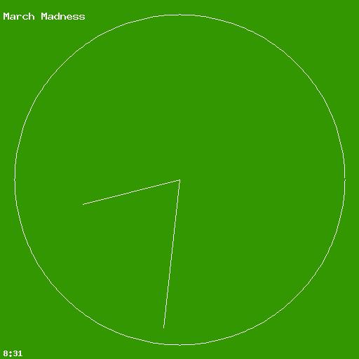 <?php $imSize = 512; $clockSize = $imSize - 40; $today = getdate(); $hour = $today[hours]; $minutes = $today[minutes]; $seconds = $today[seconds]; if ($hour > 12) { $hour -= 12; } $hourDegress = $hour * 30; $hourDegress += $minutes / 2; $minDegress = $minutes * 6; //* the cordinate system stars at 3:00 $hourDegress -= 90; if ($hourDegress < 0) { $hourDegress += 360; } $minDegress -= 90; if ($minDegress < 0) { $minDegress += 360; } //* convert to radians $hourRadians = $hourDegress / 57.295779513082; $minRadians = $minDegress / 57.295779513082; $myImage = ImageCreate($imSize, $imSize); $white = ImageColorAllocate($myImage, 255, 255, 255); $black = ImageColorAllocate($myImage, 0, 0, 0); // $red = ImageColorAllocate($myImage, 255, 0, 0); $green = ImageColorAllocate($myImage, 50, 151, 0); // $blue = ImageColorAllocate($myImage, 0, 0, 255); ImageFill($myImage, 0, 0, $green); Imageinterlace($myImage, 1); //* draw the clock circle Imagearc($myImage, $imSize/2, $imSize/2, $clockSize, $clockSize, 0, 359, $white); //* draw the hour hand $hourHandLen = ($clockSize / 2) * 0.6; $x2 = $imSize/2 + ($hourHandLen * cos($hourRadians)); $y2 = $imSize/2 + ($hourHandLen * sin($hourRadians)); ImageLine($myImage, $imSize/2, $imSize/2, $x2, $y2, $white); //* draw the minute hand $minHandLen = ($clockSize / 2) * 0.9; $x2 = $imSize/2 + ($minHandLen * cos($minRadians)); $y2 = $imSize/2 + ($minHandLen * sin($minRadians)); ImageLine($myImage, $imSize/2, $imSize/2, $x2, $y2, $white); if ($minutes < 10) { $minutes = "0$minutes"; } Imagestring($myImage, 3, 5, $imSize - 15, ($hour . ":" . $minutes), $white); Imagestring($myImage, 3, 5, 15, "March Madness", $white); header("Content-type: image/jpg"); imagejpeg($myImage); Imagedestroy($myImage); ?> |